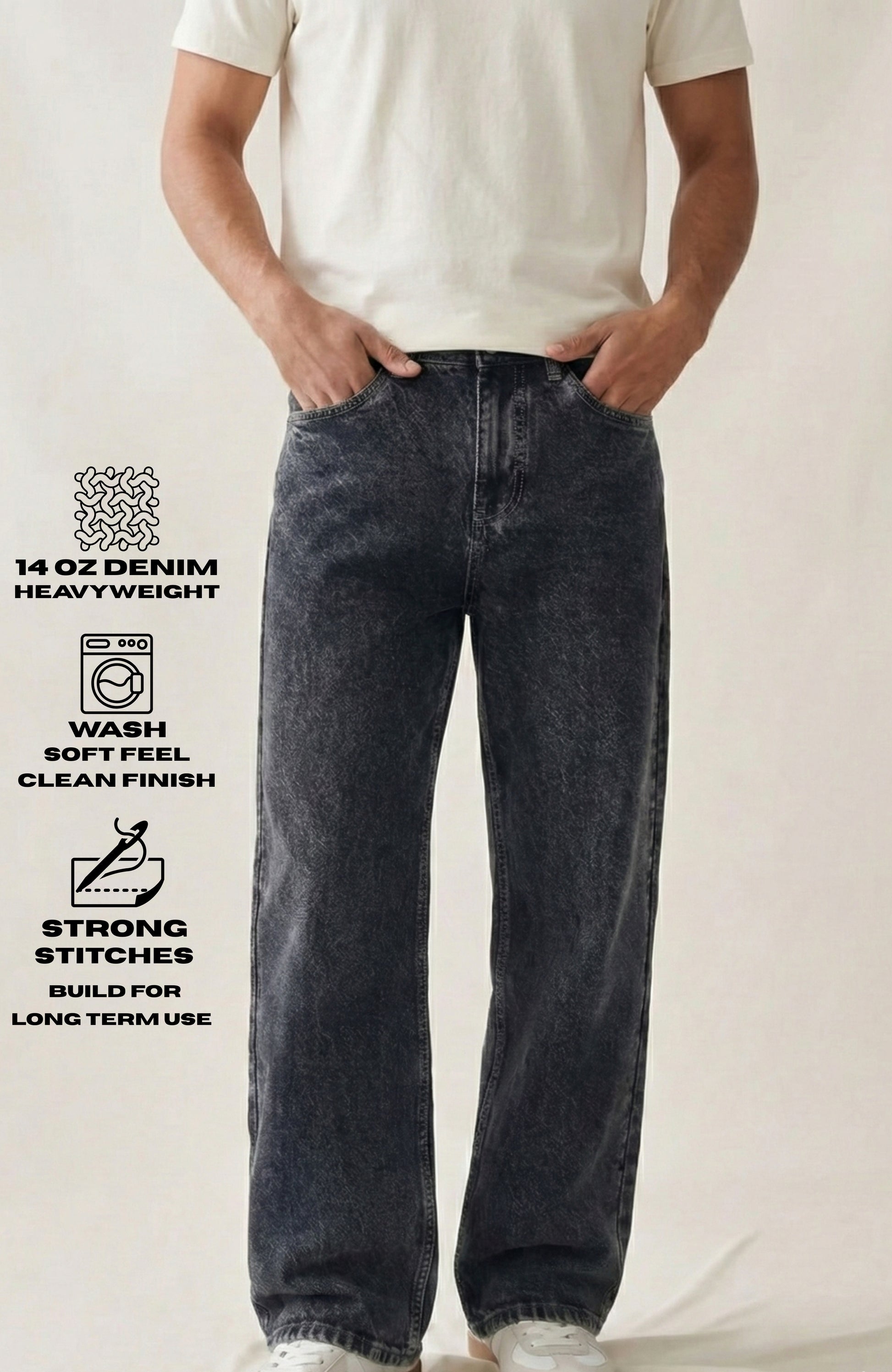 Wash Care: Normal machine wash, inside-out recommended This black denim jeans is made using 14 oz heavyweight fabric, designed for people who actually wear their jeans hard.